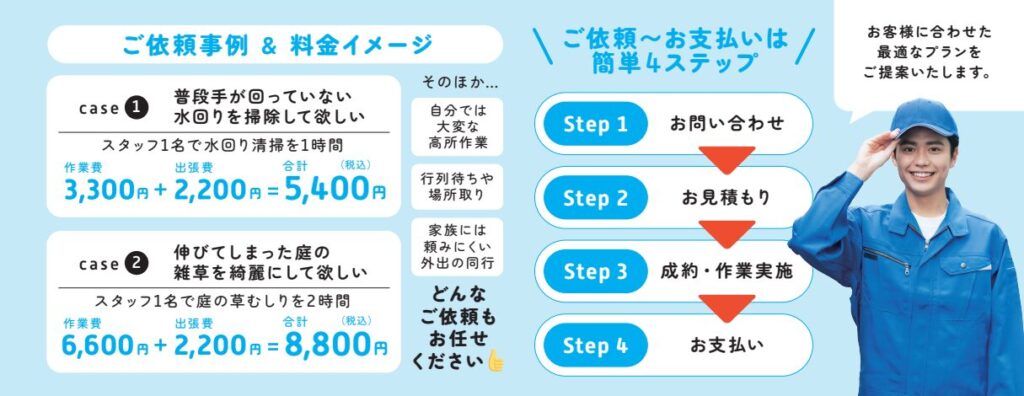 シンプルな明瞭料金「税込3,300円~/1名1時間」で必要な時、必要な分だけご依頼いただけます。